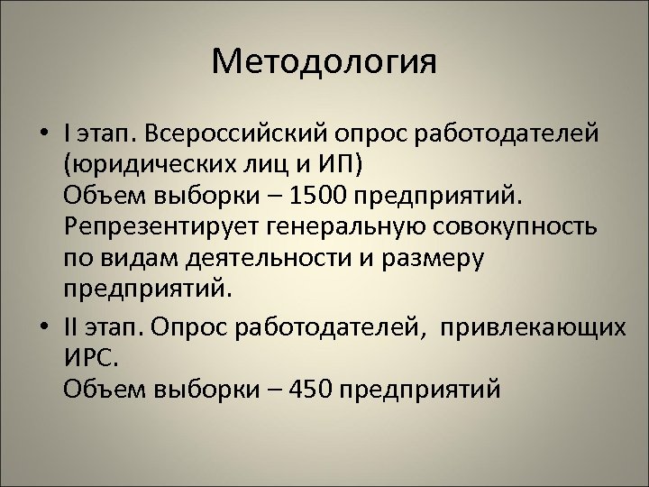 Методология • I этап. Всероссийский опрос работодателей (юридических лиц и ИП) Объем выборки – 1500 предприятий. Репрезентирует генеральную совокупность по видам деятельности и размеру предприятий. • II этап. Опрос работодателей, привлекающих ИРС. Объем выборки – 450 предприятий