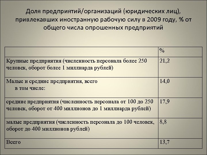 Доля предприятий/организаций (юридических лиц), привлекавших иностранную рабочую силу в 2009 году, % от общего числа опрошенных предприятий % Крупные предприятия (численность персонала более 250 человек, оборот более 1 миллиарда рублей) 21, 2 Малые и средние предприятия, всего в том числе: 14, 0 средние предприятия (численность персонала от 100 до 250 человек, оборот от 400 миллионов до 1 миллиарда рублей) 17, 9 малые предприятия (численность персонала до 100 человек, 8, 8 оборот до 400 миллионов рублей) Всего 13, 7