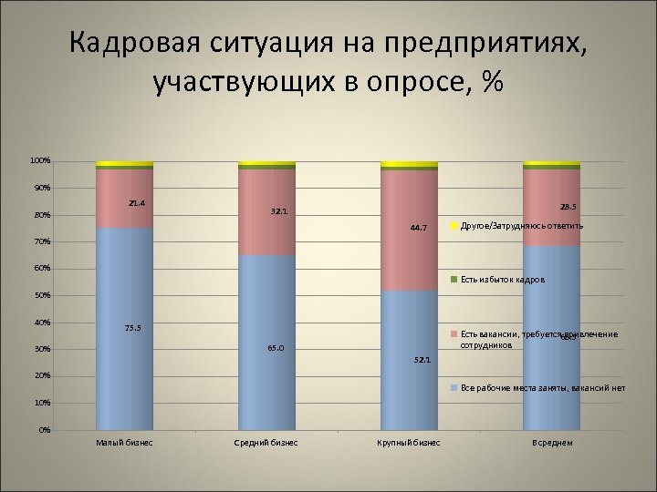 Кадровая ситуация на предприятиях, участвующих в опросе, % 100% 90% 21. 4 80% 28. 5 32. 1 44. 7 Другое/Затрудняюсь ответить 70% 60% Есть избыток кадров 50% 40% 75. 5 Есть вакансии, требуется 68. 5 привлечение сотрудников 65. 0 30% 52. 1 20% Все рабочие места заняты, вакансий нет 10% 0% Малый бизнес Средний бизнес Крупный бизнес В среднем