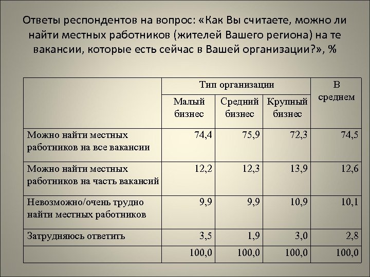 Ответы респондентов на вопрос: «Как Вы считаете, можно ли найти местных работников (жителей Вашего региона) на те вакансии, которые есть сейчас в Вашей организации? » , % Тип организации Малый бизнес Средний Крупный бизнес В среднем Можно найти местных работников на все вакансии 74, 4 75, 9 72, 3 74, 5 Можно найти местных работников на часть вакансий 12, 2 12, 3 13, 9 12, 6 Невозможно/очень трудно найти местных работников 9, 9 10, 1 Затрудняюсь ответить 3, 5 1, 9 3, 0 2, 8 100, 0