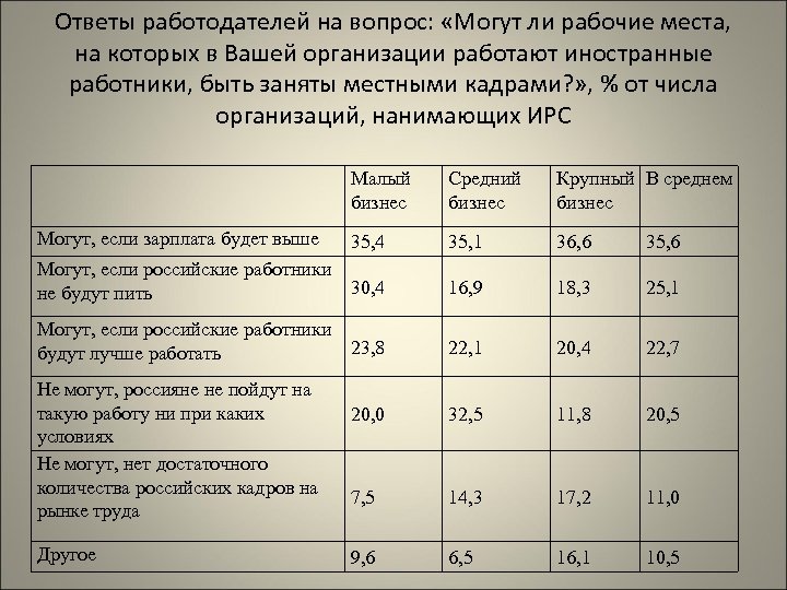 Ответы работодателей на вопрос: «Могут ли рабочие места, на которых в Вашей организации работают иностранные работники, быть заняты местными кадрами? » , % от числа организаций, нанимающих ИРС Малый бизнес Средний бизнес Крупный В среднем бизнес 35, 4 35, 1 36, 6 35, 6 Могут, если российские работники 30, 4 не будут пить 16, 9 18, 3 25, 1 Могут, если российские работники 23, 8 будут лучше работать 22, 1 20, 4 22, 7 20, 0 32, 5 11, 8 20, 5 7, 5 14, 3 17, 2 11, 0 9, 6 6, 5 16, 1 10, 5 Могут, если зарплата будет выше Не могут, россияне не пойдут на такую работу ни при каких условиях Не могут, нет достаточного количества российских кадров на рынке труда Другое