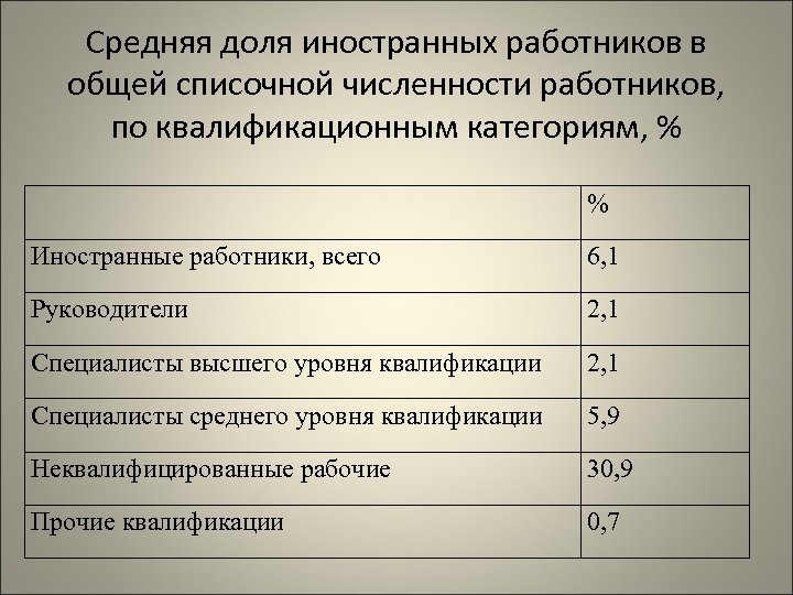 Средняя доля иностранных работников в общей списочной численности работников, по квалификационным категориям, % % Иностранные работники, всего 6, 1 Руководители 2, 1 Специалисты высшего уровня квалификации 2, 1 Специалисты среднего уровня квалификации 5, 9 Неквалифицированные рабочие 30, 9 Прочие квалификации 0, 7