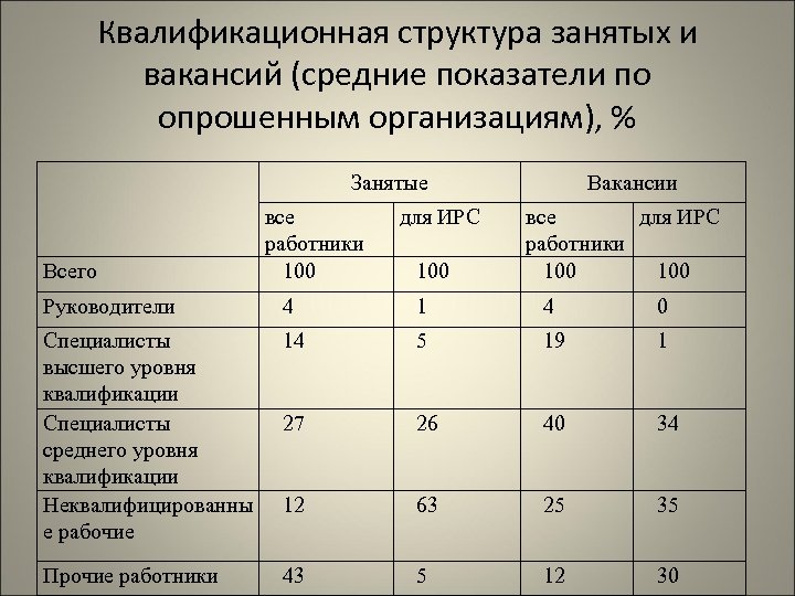 Квалификационная структура занятых и вакансий (средние показатели по опрошенным организациям), % Занятые Всего все работники 100 для ИРС 100 Вакансии все для ИРС работники 100 Руководители 4 1 4 0 Специалисты высшего уровня квалификации Специалисты среднего уровня квалификации Неквалифицированны е рабочие 14 5 19 1 27 26 40 34 12 63 25 35 Прочие работники 43 5 12 30