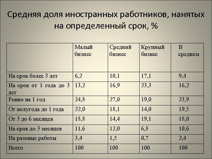 Средняя доля иностранных работников, нанятых на определенный срок, % Малый бизнес Средний бизнес Крупный бизнес В среднем 6, 2 10, 1 17, 1 9, 4 На срок от 1 года до 3 13, 2 лет Ровно на 1 год 24, 8 16, 9 23, 3 16, 2 27, 0 19, 0 23, 9 От полугода до 1 года 22, 0 18, 1 14, 0 19, 5 От 3 до 6 месяцев 18, 8 14, 4 19, 1 18, 0 На срок до 3 месяцев 11, 6 12, 0 6, 8 10, 6 На разовые работы 3, 4 1, 5 0, 7 2, 4 Всего 100 100 На срок более 3 лет