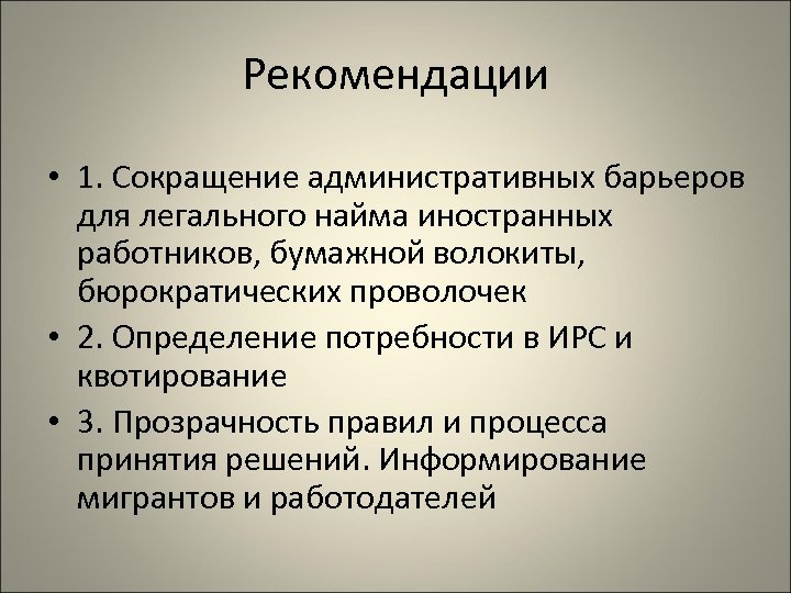 Рекомендации • 1. Сокращение административных барьеров для легального найма иностранных работников, бумажной волокиты, бюрократических проволочек • 2. Определение потребности в ИРС и квотирование • 3. Прозрачность правил и процесса принятия решений. Информирование мигрантов и работодателей