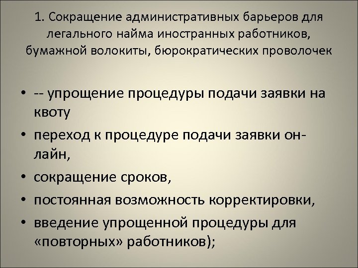 1. Сокращение административных барьеров для легального найма иностранных работников, бумажной волокиты, бюрократических проволочек • -- упрощение процедуры подачи заявки на квоту • переход к процедуре подачи заявки онлайн, • сокращение сроков, • постоянная возможность корректировки, • введение упрощенной процедуры для «повторных» работников);