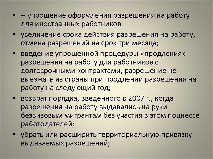 • -- упрощение оформления разрешения на работу для иностранных работников • увеличение срока действия разрешения на работу, отмена разрешений на срок три месяца; • введение упрощенной процедуры «продления» разрешения на работу для работников с долгосрочными контрактами, разрешение не выезжать из страны при продлении разрешения на работу на следующий год; • возврат порядка, введенного в 2007 г. , когда разрешения на работу выдавались на руки безвизовым мигрантам без участия в этом поцнессе работодателей; • убрать или расширить территориальную привязку выдаваемых разрешений;
