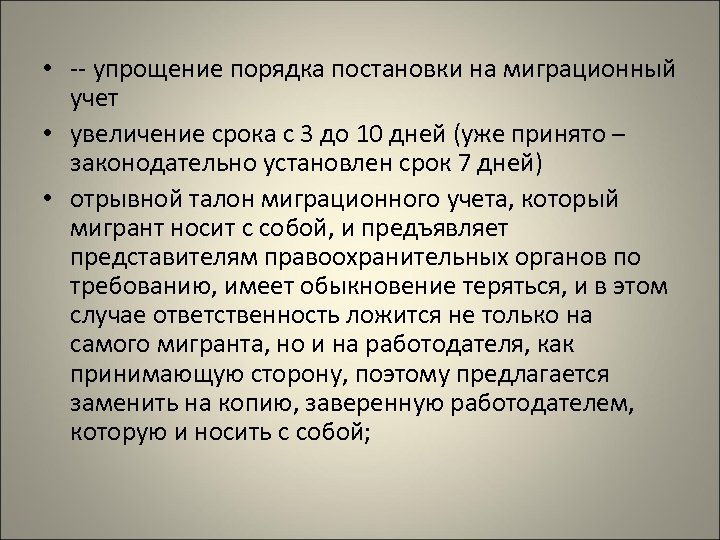 • -- упрощение порядка постановки на миграционный учет • увеличение срока с 3 до 10 дней (уже принято – законодательно установлен срок 7 дней) • отрывной талон миграционного учета, который мигрант носит с собой, и предъявляет представителям правоохранительных органов по требованию, имеет обыкновение теряться, и в этом случае ответственность ложится не только на самого мигранта, но и на работодателя, как принимающую сторону, поэтому предлагается заменить на копию, заверенную работодателем, которую и носить с собой;