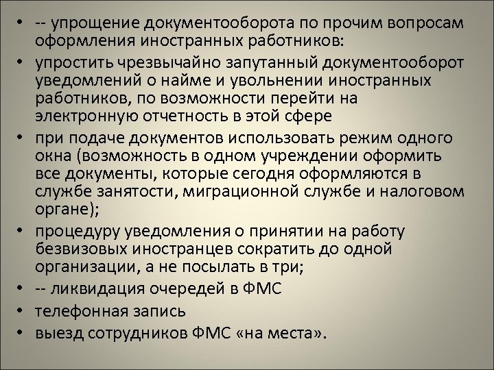 • -- упрощение документооборота по прочим вопросам оформления иностранных работников: • упростить чрезвычайно запутанный документооборот уведомлений о найме и увольнении иностранных работников, по возможности перейти на электронную отчетность в этой сфере • при подаче документов использовать режим одного окна (возможность в одном учреждении оформить все документы, которые сегодня оформляются в службе занятости, миграционной службе и налоговом органе); • процедуру уведомления о принятии на работу безвизовых иностранцев сократить до одной организации, а не посылать в три; • -- ликвидация очередей в ФМС • телефонная запись • выезд сотрудников ФМС «на места» .