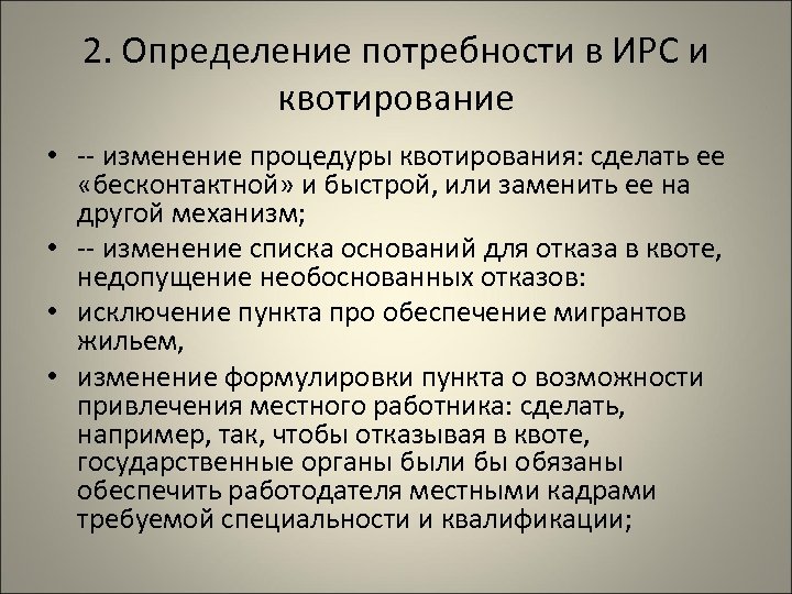 2. Определение потребности в ИРС и квотирование • -- изменение процедуры квотирования: сделать ее «бесконтактной» и быстрой, или заменить ее на другой механизм; • -- изменение списка оснований для отказа в квоте, недопущение необоснованных отказов: • исключение пункта про обеспечение мигрантов жильем, • изменение формулировки пункта о возможности привлечения местного работника: сделать, например, так, чтобы отказывая в квоте, государственные органы были бы обязаны обеспечить работодателя местными кадрами требуемой специальности и квалификации;