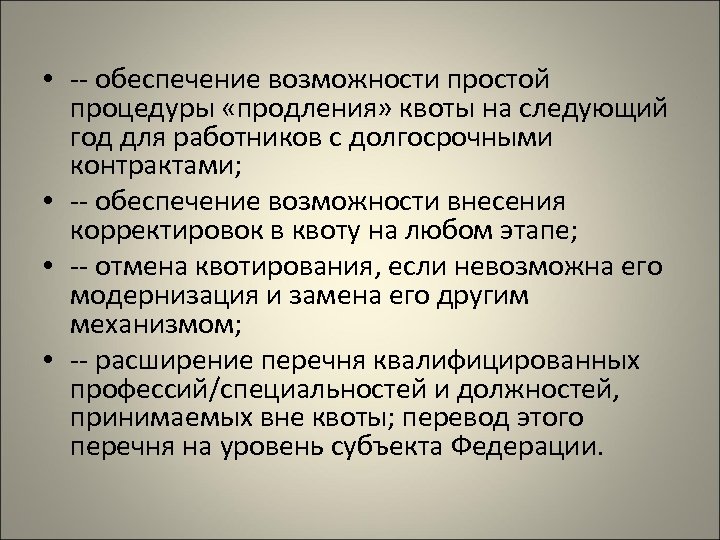 • -- обеспечение возможности простой процедуры «продления» квоты на следующий год для работников с долгосрочными контрактами; • -- обеспечение возможности внесения корректировок в квоту на любом этапе; • -- отмена квотирования, если невозможна его модернизация и замена его другим механизмом; • -- расширение перечня квалифицированных профессий/специальностей и должностей, принимаемых вне квоты; перевод этого перечня на уровень субъекта Федерации.
