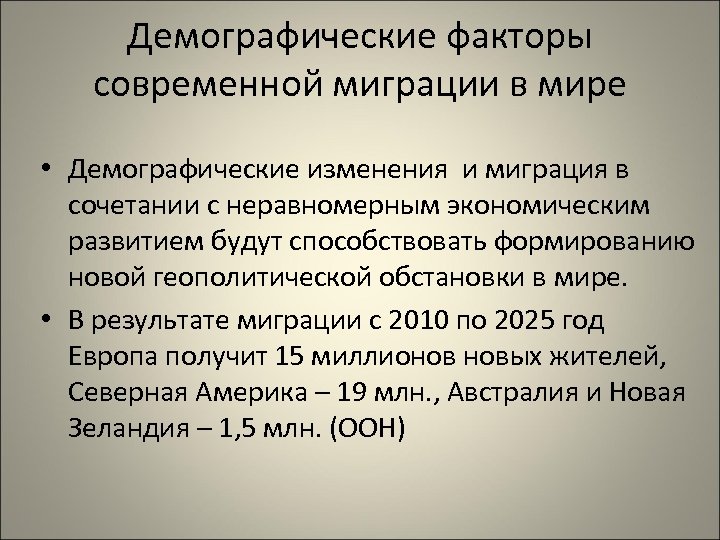 Демографические факторы современной миграции в мире • Демографические изменения и миграция в сочетании с неравномерным экономическим развитием будут способствовать формированию новой геополитической обстановки в мире. • В результате миграции с 2010 по 2025 год Европа получит 15 миллионов новых жителей, Северная Америка – 19 млн. , Австралия и Новая Зеландия – 1, 5 млн. (ООН)