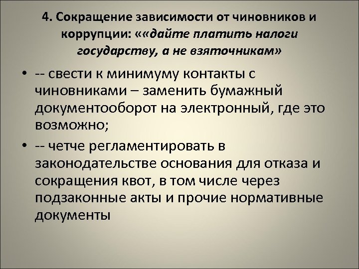 4. Сокращение зависимости от чиновников и коррупции: « «дайте платить налоги государству, а не взяточникам» • -- свести к минимуму контакты с чиновниками – заменить бумажный документооборот на электронный, где это возможно; • -- четче регламентировать в законодательстве основания для отказа и сокращения квот, в том числе через подзаконные акты и прочие нормативные документы