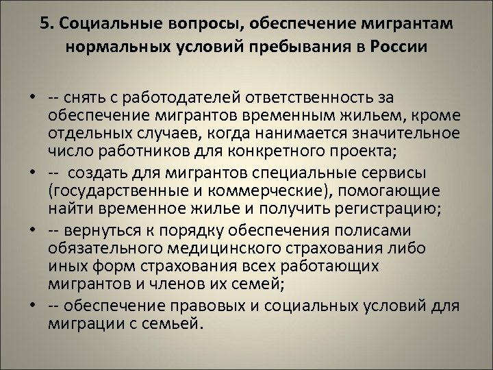 5. Социальные вопросы, обеспечение мигрантам нормальных условий пребывания в России • -- снять с работодателей ответственность за обеспечение мигрантов временным жильем, кроме отдельных случаев, когда нанимается значительное число работников для конкретного проекта; • -- создать для мигрантов специальные сервисы (государственные и коммерческие), помогающие найти временное жилье и получить регистрацию; • -- вернуться к порядку обеспечения полисами обязательного медицинского страхования либо иных форм страхования всех работающих мигрантов и членов их семей; • -- обеспечение правовых и социальных условий для миграции с семьей.