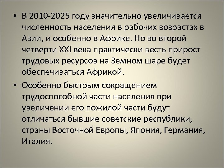 • В 2010 -2025 году значительно увеличивается численность населения в рабочих возрастах в Азии, и особенно в Африке. Но во второй четверти XXI века практически весть прирост трудовых ресурсов на Земном шаре будет обеспечиваться Африкой. • Особенно быстрым сокращением трудоспособной части населения при увеличении его пожилой части будут отличаться бывшие советские республики, страны Восточной Европы, Япония, Германия, Италия.