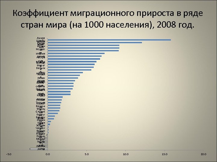 Коэффициент миграционного прироста в ряде стран мира (на 1000 населения), 2008 год. Люксе Швейц мбург Слове ария Испан ния Норвег ия ия Италия Чехия Австра лия Канада Швеци Мальт я Бельги а я Кипр Австри Новая я Зелан Дания дия Ислан Велик дия обрита Греция ния Финля ндия США Нидер ланды Россия Турция Хорват Венгри ия Франц я Словак ия Португ ия Белару алия Ирлан сь Украи дия Эстони на Черног я Румын ория Болгар ия Польш ия Молдо а Герма ва ния Латвия Литва -5. 0 0. 0 5. 0 10. 0 15. 0 20. 0