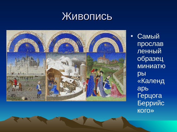 Живопись • Самый прослав ленный образец миниатю ры «Календ арь Герцога Беррийс кого»
