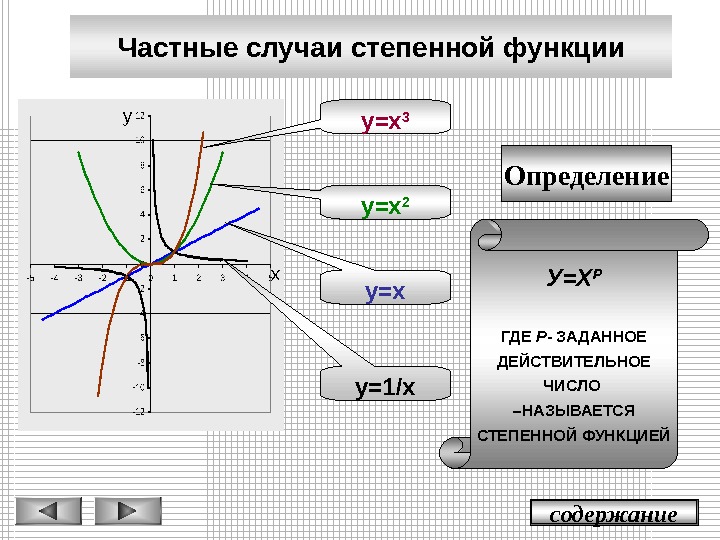Частные случаи степенной функции у=х 3 у=х 2 у=х у=1/х содержание. У=Х Р ГДЕ Р — ЗАДАННОЕ ДЕЙСТВИТЕЛЬНОЕ ЧИСЛО – НАЗЫВАЕТСЯ СТЕПЕННОЙ ФУНКЦИЕЙу х Определение