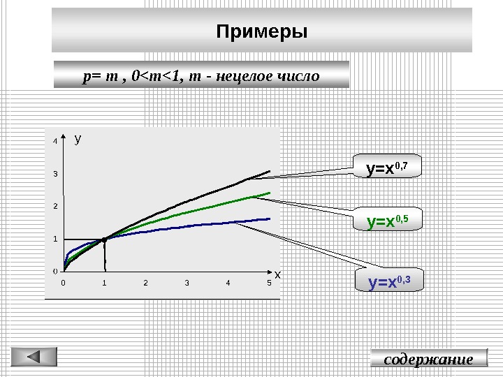 Примеры содержаниеp= m , 0 <m<1, m — нецелое число у х у=х 0, 3у=х 0, 5у=х 0,