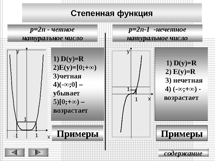 Степенная функция содержаниеp=2n-1 -нечетное натуральное числоp=2n — четное натуральное число у х11 -1 1) D(y)=R 2)E(y)=[0; + ∞) 3)четная 4)(-∞; 0] – убывает 5)[0; +∞) – возрастает Примеры у х 11 1 1) D(y)=R 2) E(y)=R 3) нечетная 4) (-∞; +∞) — возрастает Примеры