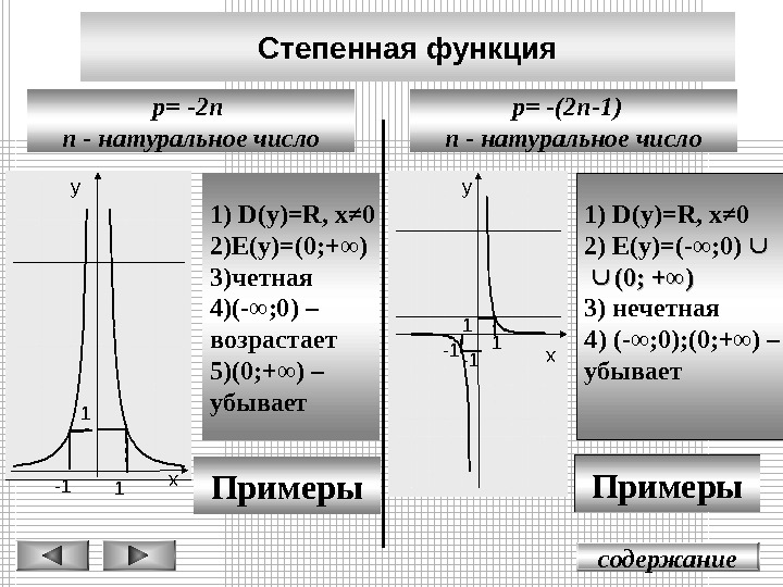 Степенная функция содержаниеp= -(2n-1) n — натуральное числоp= -2n n — натуральное число у х 1-1 1) D(y)=R, x ≠ 0 2)E(y)=(0; + ∞) 3)четная 4)(-∞; 0) – возрастает 5)(0; +∞) – убывает Примеры у х11 1 1) D(y)=R, х ≠ 0 2) E(y)=(- ∞; 0) (0; + ∞∞ )) 3) нечетная 4) (-∞; 0); (0; +∞) – убывает Примеры-1 —
