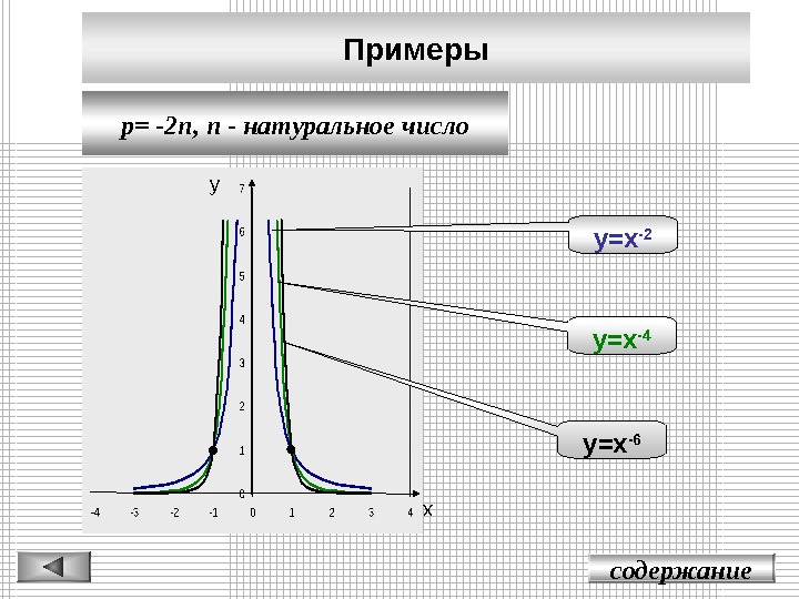 Примеры p=2n – четное натуральное число содержаниеу=х 2 у=х 4 у=х 6у х