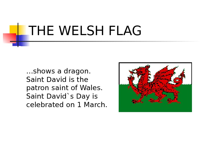 THE WELSH FLAG … shows a dragon. Saint David is the patron saint of Wales. Saint David`s Day is celebrated on 1 March.