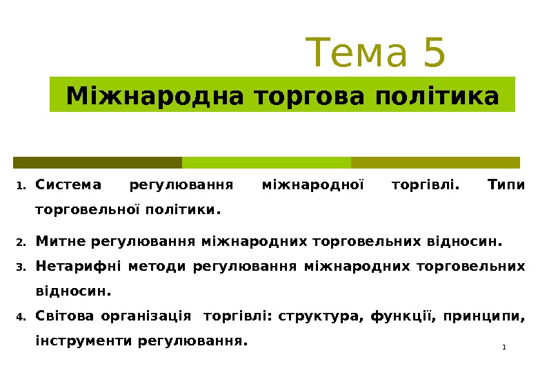 1 Тема 5 Міжнародна торгова політика 1. Система регулювання міжнародної торгівлі. Типи торговельної політики. 2. Митне регулювання міжнародних торговельних відносин. 3. Нетарифні методи регулювання міжнародних торговельних відносин. 4. Світова організація торгівлі: структура, функції, принципи, інструменти регулювання.
