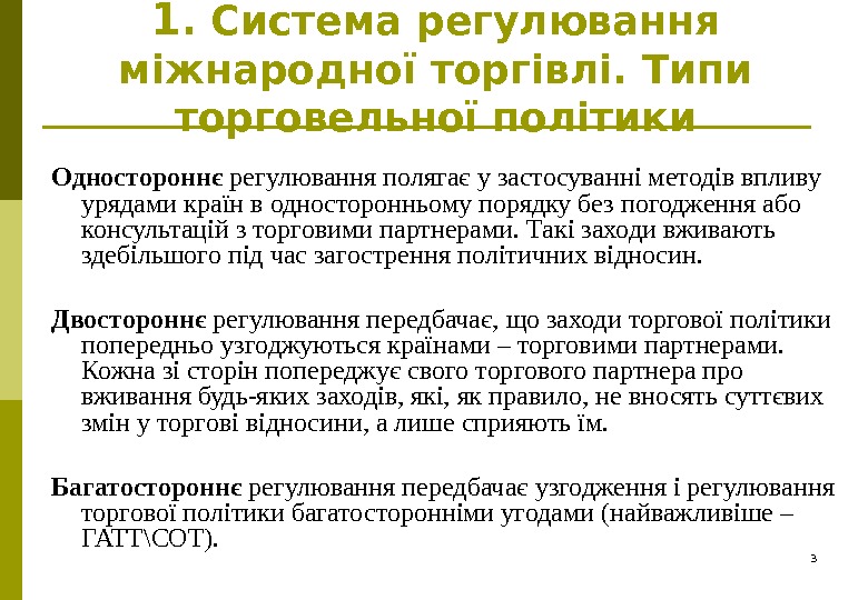1. Система регулювання міжнародної торгівлі. Типи торговельної політики Одностороннє регулювання полягає у застосуванні методів впливу урядами країн в односторонньому порядку без погодження або консультацій з торговими партнерами. Такі заходи вживають здебільшого під час загострення політичних відносин. Двостороннє регулювання передбачає, що заходи торгової політики попередньо узгоджуються країнами – торговими партнерами. Кожна зі сторін попереджує свого торгового партнера про вживання будь-яких заходів, які, як правило, не вносять суттєвих змін у торгові відносини, а лише сприяють їм. Багатостороннє регулювання передбачає узгодження і регулювання торгової політики багатосторонніми угодами (найважливіше – ГАТТ\СОТ).