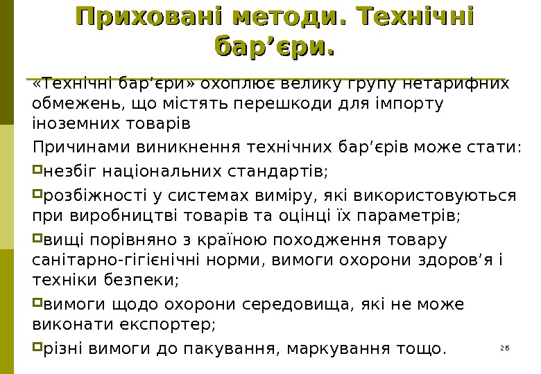 Приховані методи. Технічні бар’єри. «Технічні бар’єри» охоплює велику групу нетарифних обмежень, що містять перешкоди для імпорту іноземних товарів Причинами виникнення технічних бар’єрів може стати: незбіг національних стандартів; розбіжності у системах виміру, які використовуються при виробництві товарів та оцінці їх параметрів; вищі порівняно з країною походження товару санітарно-гігієнічні норми, вимоги охорони здоров’я і техніки безпеки; вимоги щодо охорони середовища, які не може виконати експортер; різні вимоги до пакування, маркування тощо.