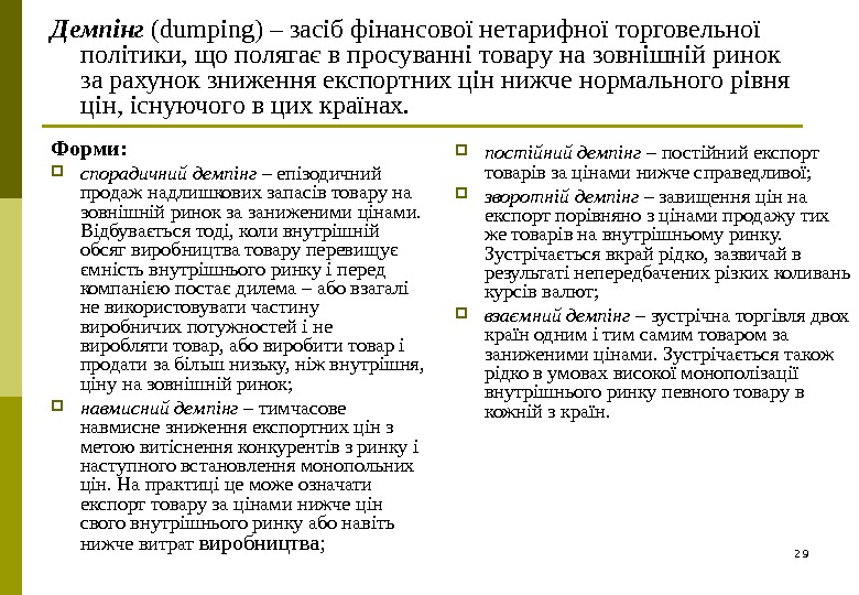 29 Демпінг ( dumping ) – засіб фінансової нетарифної торговельної політики, що полягає в просуванні товару на зовнішній ринок за рахунок зниження експортних цін нижче нормального рівня цін, існуючого в цих країнах. Форми: спорадичний демпінг – епізодичний продаж надлишкових запасів товару на зовнішній ринок за заниженими цінами. Відбувається тоді, коли внутрішній обсяг виробництва товару перевищує ємність внутрішнього ринку і перед компанією постає дилема – або взагалі не використовувати частину виробничих потужностей і не виробляти товар, або виробити товар і продати за більш низьку, ніж внутрішня, ціну на зовнішній ринок; навмисний демпінг – тимчасове навмисне зниження експортних цін з метою витіснення конкурентів з ринку і наступного встановлення монопольних цін. На практиці це може означати експорт товару за цінами нижче цін свого внутрішнього ринку або навіть нижче витрат виробництва; постійний демпінг – постійний експорт товарів за цінами нижче справедливої; зворотній демпінг – завищення цін на експорт порівняно з цінами продажу тих же товарів на внутрішньому ринку. Зустрічається вкрай рідко, зазвичай в результаті непередбачених різких коливань курсів валют; взаємний демпінг – зустрічна торгівля двох країн одним і тим самим товаром за заниженими цінами. Зустрічається також рідко в умовах високої монополізації внутрішнього ринку певного товару в кожній з країн.