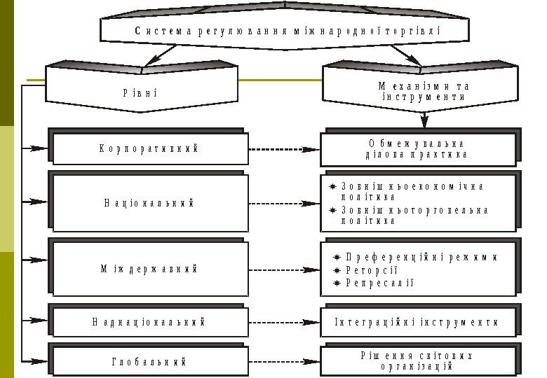 4 С и с т е м а р е г у л ю в а н н я м і ж н а р о д н о ї т о р г і в л і Р і в н і М е х а н і з м и т а і н с т р у м е н т и К о р п о р а т и в н и й. О б м е ж у в а л ь н а д і л о в а п р а к т и к а Н а ц і о н а л ь н и й З о в н і ш н ь о е к о н о м і ч н а п о л і т и к а З о в н і ш н ь о т о р г о в е л ь н а п о л і т и к а М і ж д е р ж а в н и й П р е ф е р е н ц і й н і р е ж и м и Р е т о р с і ї Р е п р е с а л і ї Н а д н а ц і о н а л ь н и йІ н т е г р а ц і й н і і н с т р у м е н т и Г л о б а л ь н и й Р і ш е н н я с в і т о в и х о р г а н і з а ц і й
