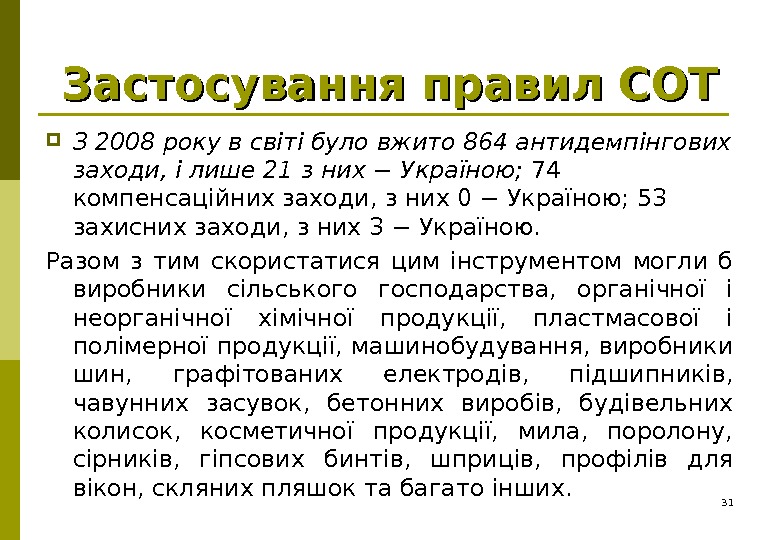 Застосування правил СОТ З 2008 року в світі було вжито 864 антидемпінгових заходи, і лише 21 з них − Україною; 74 компенсаційних заходи, з них 0 − Україною; 53 захисних заходи, з них 3 − Україною. Разом з тим скористатися цим інструментом могли б виробники сільського господарства, органічної і неорганічної хімічної продукції, пластмасової і полімерної продукції, машинобудування, виробники шин, графітованих електродів, підшипників, чавунних засувок, бетонних виробів, будівельних колисок, косметичної продукції, мила, поролону, сірників, гіпсових бинтів, шприців, профілів для вікон, скляних пляшок та багато інших.