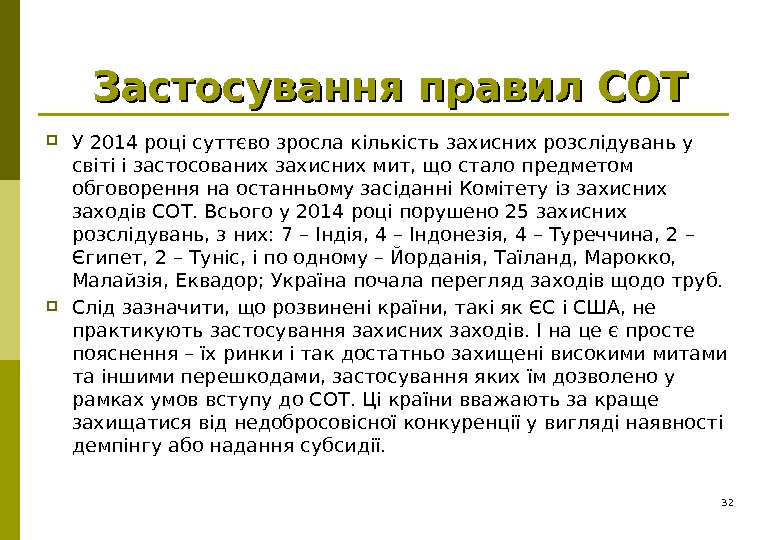 Застосування правил СОТ У 2014 році суттєво зросла кількість захисних розслідувань у світі і застосованих захисних мит, що стало предметом обговорення на останньому засіданні Комітету із захисних заходів СОТ. Всього у 2014 році порушено 25 захисних розслідувань, з них: 7 – Індія, 4 – Індонезія, 4 – Туреччина, 2 – Єгипет, 2 – Туніс, і по одному – Йорданія, Таїланд, Марокко, Малайзія, Еквадор; Україна почала перегляд заходів щодо труб. Слід зазначити, що розвинені країни, такі як ЄС і США, не практикують застосування захисних заходів. І на це є просте пояснення – їх ринки і так достатньо захищені високими митами та іншими перешкодами, застосування яких їм дозволено у рамках умов вступу до СОТ. Ці країни вважають за краще захищатися від недобросовісної конкуренції у вигляді наявності демпінгу або надання субсидії.