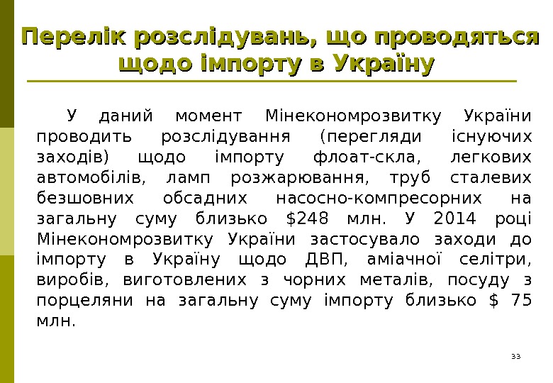Перелік розслідувань, що проводяться щодо імпорту в Україну У даний момент Мінекономрозвитку України проводить розслідування (перегляди існуючих заходів) щодо імпорту флоат-скла, легкових автомобілів, ламп розжарювання, труб сталевих безшовних обсадних насосно-компресорних на загальну суму близько $248 млн. У 2014 році Мінекономрозвитку України застосувало заходи до імпорту в Україну щодо ДВП, аміачної селітри, виробів, виготовлених з чорних металів, посуду з порцеляни на загальну суму імпорту близько $ 75 млн.