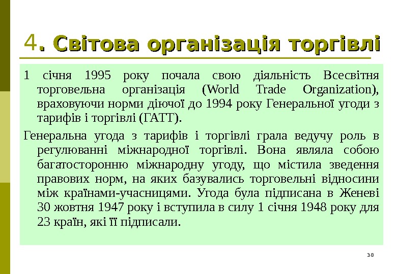 384. Світова організація торгівлі 1 січня 1995 року почала свою діяльність Всесвітня торговельна організація (World Trade Organization), враховуючи норми діючої до 1994 року Генеральної угоди з тарифів і торгівлі (ГАТТ). Генеральна угода з тарифів і торгівлі грала ведучу роль в регулюванні міжнародної торгівлі. Вона являла собою багатосторонню міжнародну угоду, що містила зведення правових норм, на яких базувались торговельні відносини між країнами-учасницями. Угода була підписана в Женеві 30 жовтня 1947 року і вступила в силу 1 січня 1948 року для 23 країн, які її підписали.