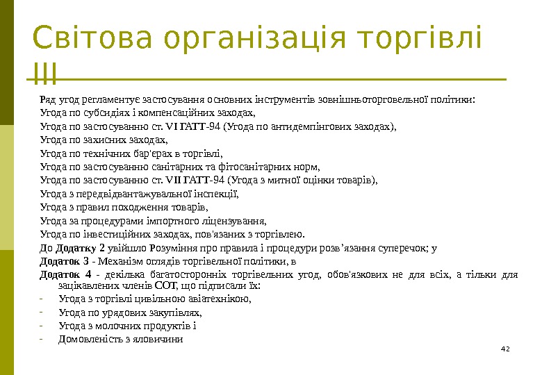 41 Світова організація торгівлі ІІ Основу правової системи СОТ складає пакет документів, головним з яких є Угода про СОТ, а також чотири додатки до нього. У Додаток 1 входять три основоположні угоди СОТ: Генеральна угода про тарифи і торгівлю 1994 р. (включаючи положення Генеральної угоди про тарифи і торгівлю 1947 р. з урахуванням змін, внесених з моменту підписання), Генеральна угода з торгівлі послугами (ГАТС) і Угода по торгівельних аспектах прав інтелектуальної власності (ТРІПС). Крім того, в Додаток 1 включені дві угоди, які встановлюють права та зобов’язання урядів по регулюванню торгівлі окремими категоріями товарів: Угода з сільського господарства і Угода з текстилю і одягу.