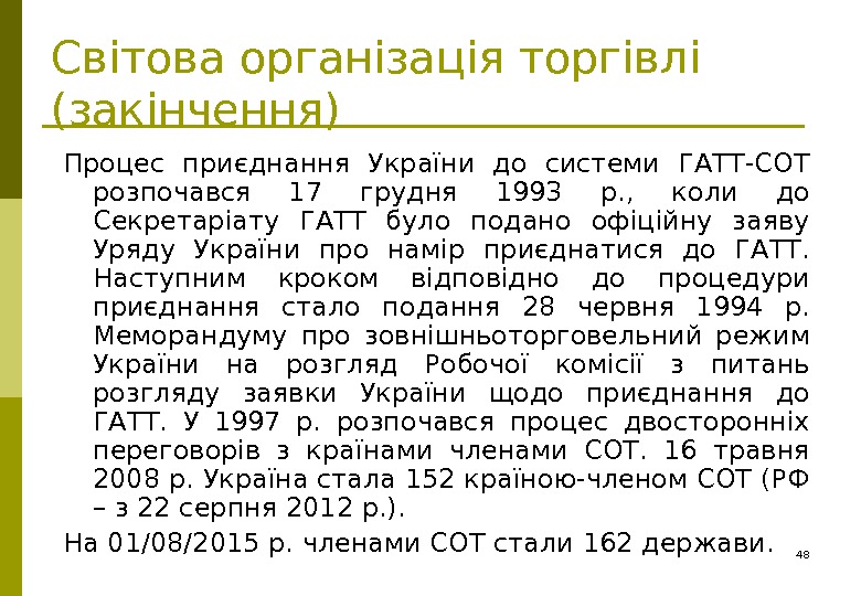 48 Світова організація торгівлі (закінчення) Процес приєднання України до системи ГАТТ-СОТ розпочався 17 грудня 1993 р. , коли до Секретаріату ГАТТ було подано офіційну заяву Уряду України про намір приєднатися до ГАТТ. Наступним кроком відповідно до процедури приєднання стало подання 28 червня 1994 р. Меморандуму про зовнішньоторговельний режим України на розгляд Робочої комісії з питань розгляду заявки України щодо приєднання до ГАТТ. У 1997 р. розпочався процес двосторонніх переговорів з країнами членами СОТ. 16 травня 2008 р. Україна стала 152 країною-членом СОТ (РФ – з 22 серпня 2012 р. ). На 01/08/2015 р. членами СОТ стали 162 держави.