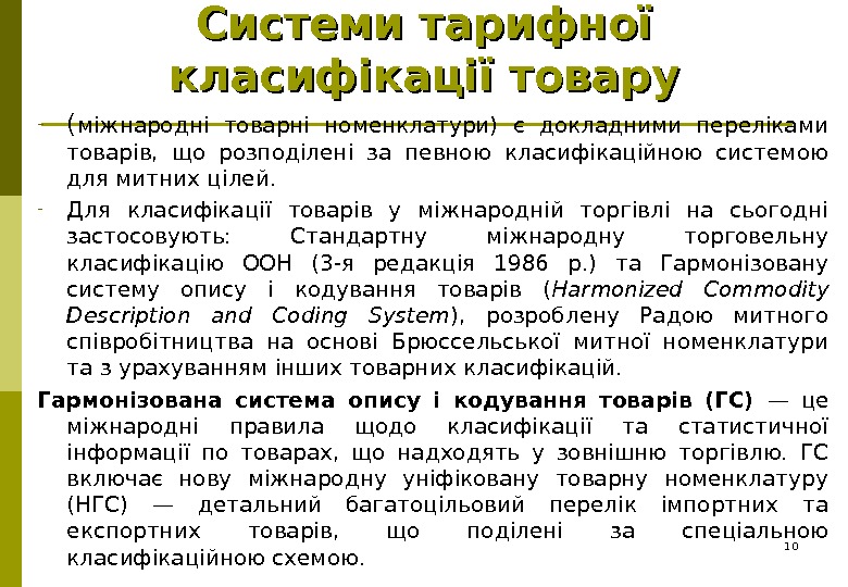 Системи тарифної класифікації товару — ( міжнародні товарні номенклатури) є докладними переліками товарів, що розподілені за певною класифікаційною системою для митних цілей. — Для класифікації товарів у міжнародній торгівлі на сьогодні застосовують: Стандартну міжнародну торговельну класифікацію ООН (3 -я редакція 1986 р. ) та Гармонізовану систему опису і кодування товарів ( Harmonized Commodity Description and Coding System ), розроблену Радою митного співробітництва на основі Брюссельської митної номенклатури та з урахуванням інших товарних класифікацій. Гармонізована система опису і кодування товарів (ГС) — це міжнародні правила щодо класифікації та статистичної інформації по товарах, що надходять у зовнішню торгівлю. ГС включає нову міжнародну уніфіковану товарну номенклатуру (НГС) — детальний багатоцільовий перелік імпортних та експортних товарів, що поділені за спеціальною класифікаційною схемою.