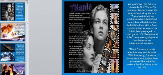 Презентация Титаник Презентация Титаник рассказывается о создании фильма Титаник. В презентации на английском языке подробно описывает история создания фильма Титаник. Также в докладе имеются фрагменты с популярного фильма.