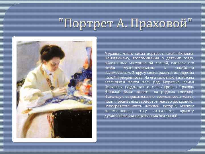 "Портрет А. Праховой" Мурашко часто писал портреты своих близких. По-видимому, воспоминания о детских годах, обделенных материнской лаской, сделали его особо чувствительным к семейным взаимосвязям. В кругу своих родных он обретал покой и уверенность. На его полотнах и пастелях запечатлен почти весь род Мурашко, семья Праховых (художник и сын Адриана Прахова Николай были женаты на родных сестрах). Используя выразительные возможности жеста, позы, предметных атрибутов, мастер раскрывает непосредственность детской натуры, мягкую женственность, силу интеллекта, красоту духовной жизни окружавших его людей.