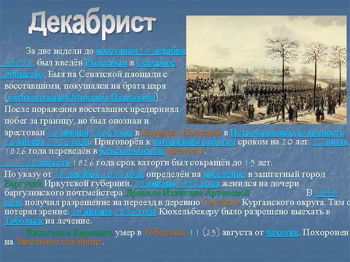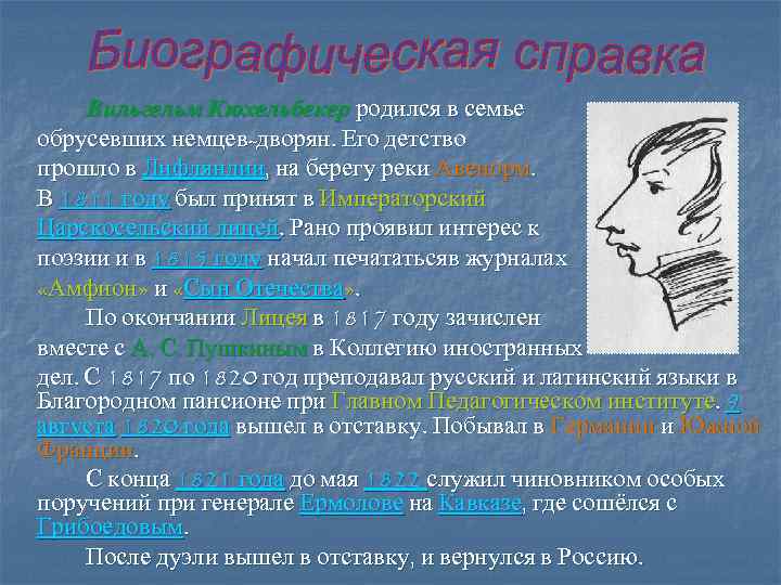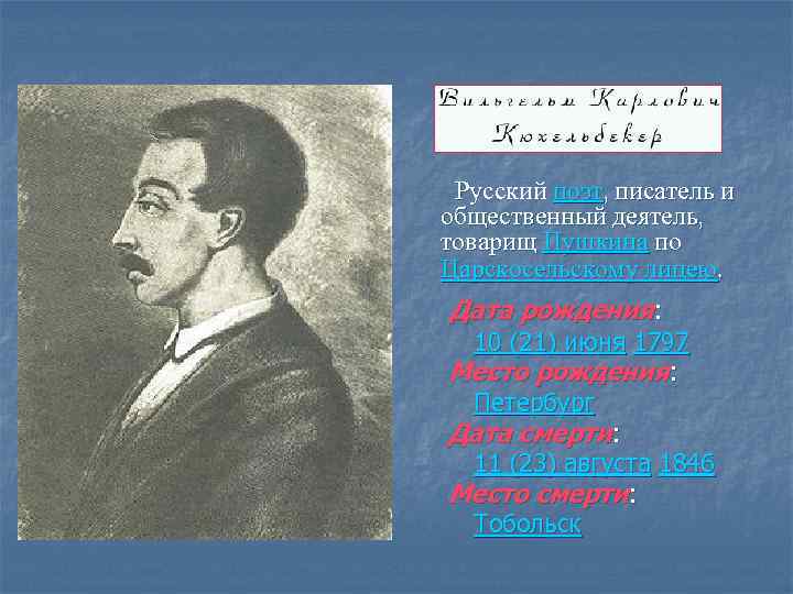Русский поэт, писатель и Ру общественный деятель, товарищ Пушкина по Царскосельскому лицею. Дата рождения: 10 (21) июня 1797 Место рождения: Петербург Дата смерти: 11 (23) августа 1846 Место смерти: Тобольск