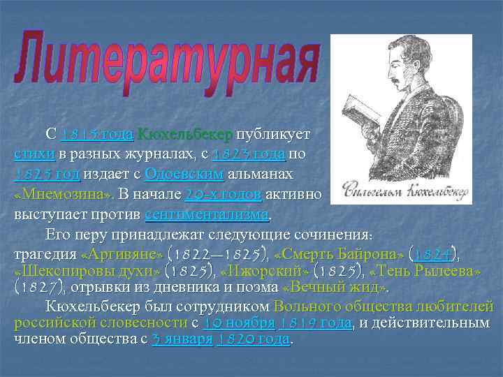 Презентация ученика 9”В” класса Колененкова Ильи на тему “Жизнь и творчество Вильгельма Карловича Кюхельбекера” Кюхельбекера
