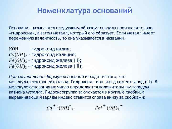 Основные физические свойства Свойства • Гидроксиды щелочных металлов – при обычных условиях твёрдые белые кристаллические вещества, мылкие на ощупь, хорошо растворимые в воде (процесс экзотермический) , легкоплавки. • Гидроксиды щелочноземельных металлов – белые порошкообразные вещества, гораздо менее растворимы в воде по сравнению с гидроксидами щелочных металлов. • Нерастворимые в воде основания образуются в реакциях ионного обмена в виде гелеобразных осадков, разлагающихся при длительном хранении. Примеры