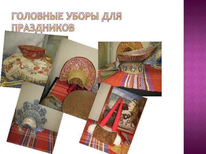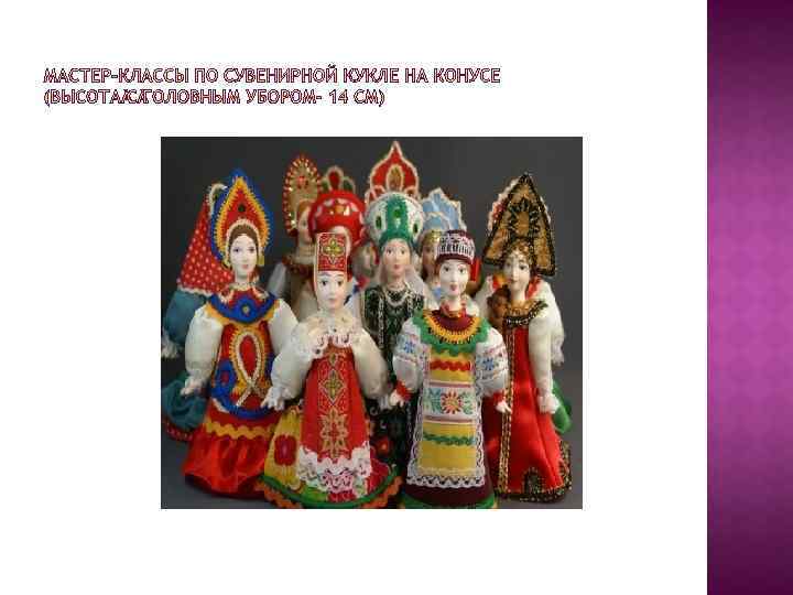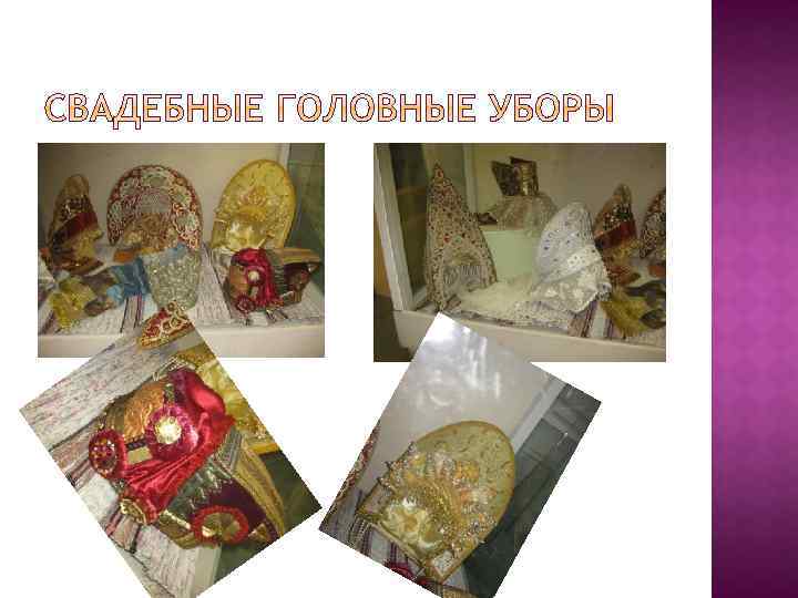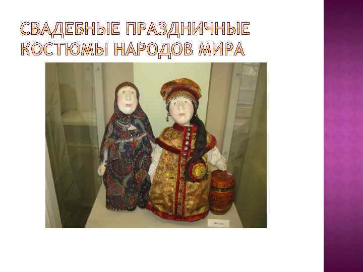 В музее кукол представлены экспозиции постоянные и временные. Одна из временных выставок в октябре-ноябре 2017 г. посвящена свадебным и праздничным костюмам народов мира. На фотографиях из музея кукол можно увидеть праздничные женские головные уборы разных областей России ( тамбовской, орловской, вологодской нижегородской и др. губерний) : разновидности кокошников- каблучок, сороку, кику рогатую, девичьи уборы- коруна, почелок с хлобыстнем. Все они богато расшиты бусинами, жемчугом, золотым шитьем.