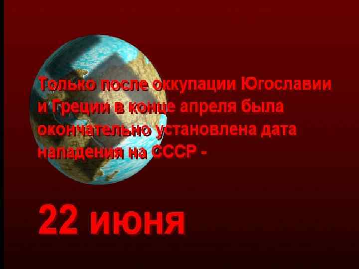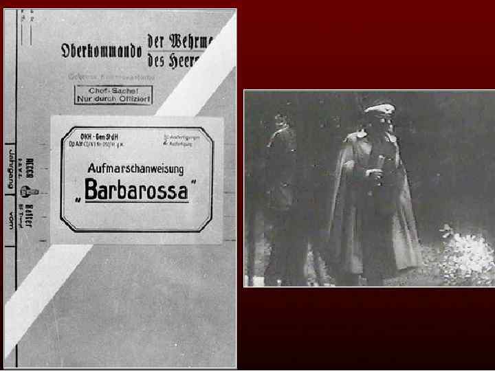 «План Барбаросса» • Директива Гитлера № 21 о подготовке • нападения на СССР • Ставка фюрера, 18 декабря 1940 г. • Германские вооруженные силы должны быть готовы разбить Советскую Россию в ходе кратковременной кампании …» • В основу плана была положена идея молниеносной военной операции. • Сроки выполнения: май-сентябрь 1941 г.