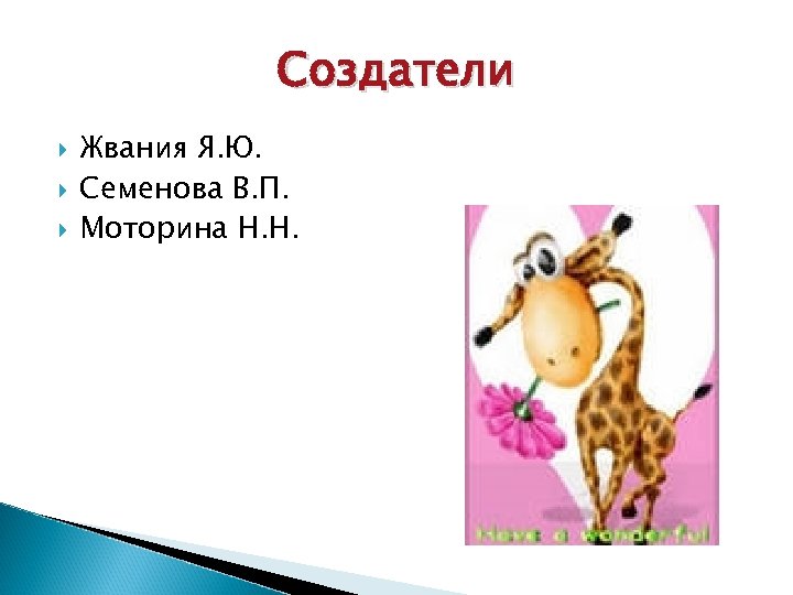 Создатели Жвания Я. Ю. Семенова В. П. Моторина Н. Н.