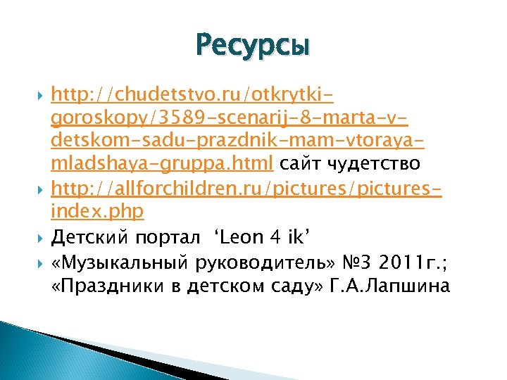 Ресурсы http: //chudetstvo. ru/otkrytkigoroskopy/3589 -scenarij-8 -marta-vdetskom-sadu-prazdnik-mam-vtorayamladshaya-gruppa. html сайт чудетство http: //allforchildren. ru/picturesindex. php Детский портал ‘Leon 4 ik’ «Музыкальный руководитель» № 3 2011 г. ; «Праздники в детском саду» Г. А. Лапшина