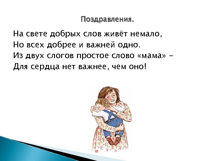 Поздравления. На свете добрых слов живёт немало, Но всех добрее и важней одно. Из двух слогов простое слово «мама» Для сердца нет важнее, чем оно!