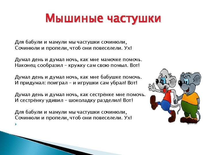 Мышиные частушки Для бабули и мамули мы частушки сочинюли, Сочинюли и пропели, чтоб они повеселели. Ух! Думал день и думал ночь, как мне мамочке помочь. Наконец сообразил – кружку сам свою помыл. Вот! Думал день и думал ночь, как мне бабушке помочь. И придумал: поиграл – и игрушки сам убрал! Вот! Думал день и думал ночь, как сестрёнке мне помочь. И сестрёнку удивил – шоколадку разделил! Вот! Для бабули и мамули мы частушки сочинюли, Сочинюли и пропели, чтоб они повеселели. Ух!